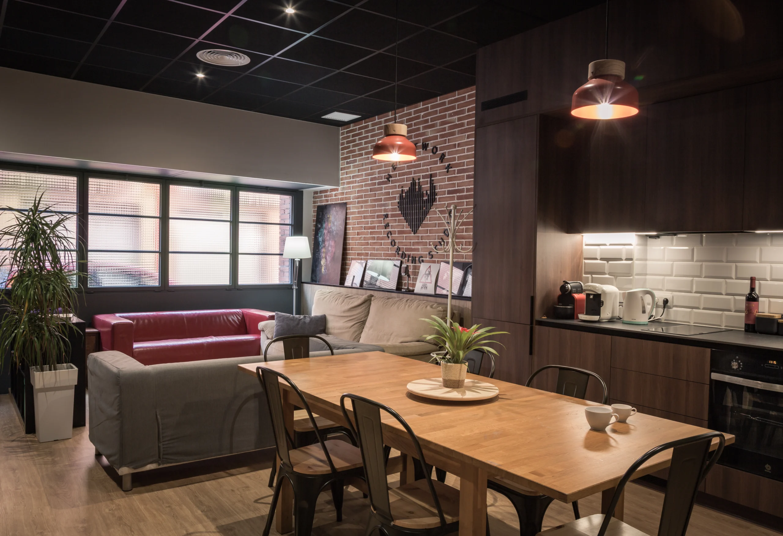 The studio is equipped with a full kitchen and dedicated lounge space with sofas perfect to take a break and hang out.