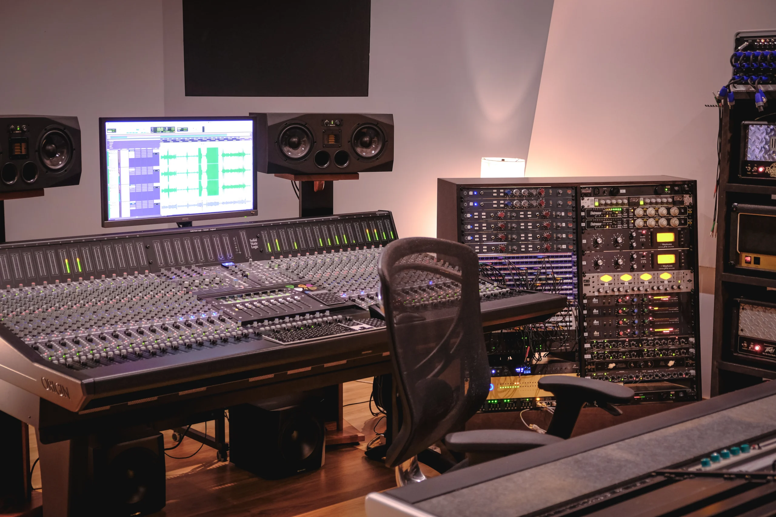 Our state of the art control room features a SSL ORIGIN console with classic 242 EQ and a 4000E-style style bus compressor fitted with two WES Audio NGLeveler automation system paired with ten BAE 1073 preamps—faithful recreations of the classic 1970’s Neve 1073 units, along with an assortment of high end analog and digital outboard gear.